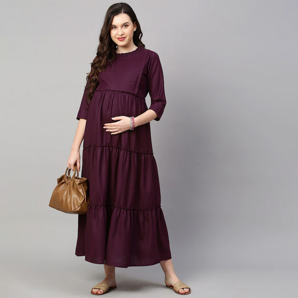 Women Purple Solid Maternity Nursing Empire Midi Sustainable Dress